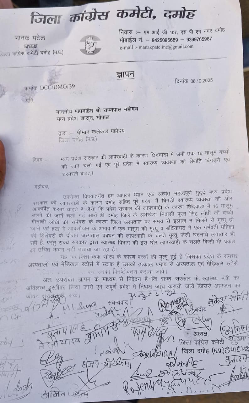 दमोह। जिला कांग्रेस कमेटी दमोह द्वारा शहर के अस्पताल चौराहा पर मध्य प्रदेश सरकार की लापरवाही के विरोध में प्रदर्शन किया गया। हाल ही में छिंदवाड़ा में खराब स्वास्थ्य सुविधाओं के कारण अब तक 16 बच्चों की मौत हो चुकी है, जिसके विरोध में कांग्रेस कार्यकर्ताओं ने मुख्यमंत्री का पुतला दहन करने का प्रयास किया।