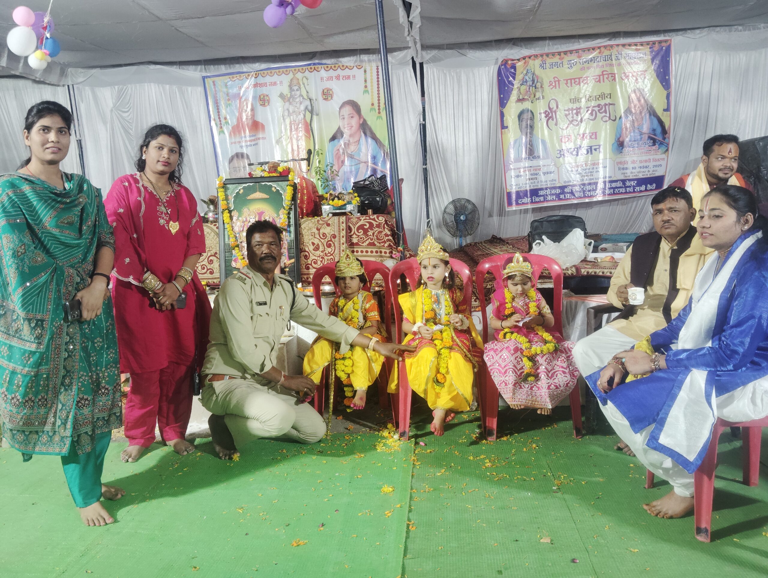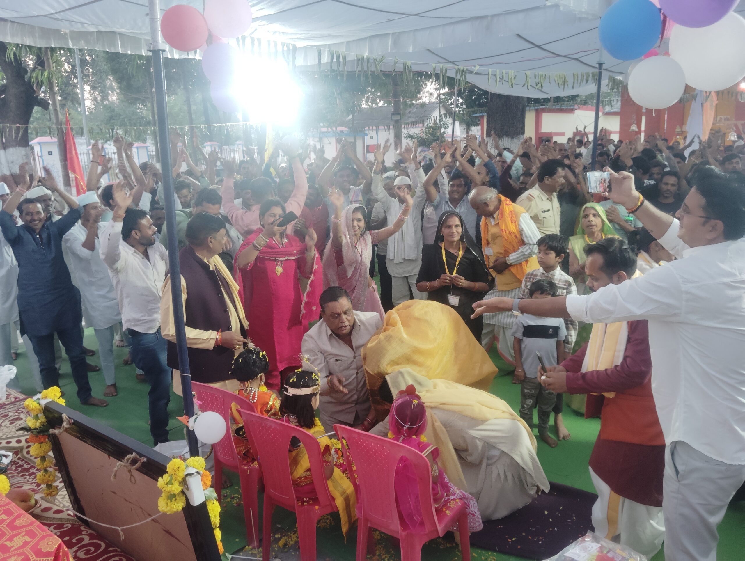 कथा का सबसे आकर्षक और भावनात्मक क्षण वह रहा जब छोटे-छोटे बच्चों ने श्रीराम, लक्ष्मण, माता सीता और जनकपुर की झांकी के रूप में मंच पर प्रवेश किया। जैसे ही बच्चों के स्वरूप प्रकट हुए, समस्त उपस्थितजन भावविह्वल हो उठे और पूरा परिसर “जय श्रीराम” के जयघोष से गूंज उठा।