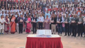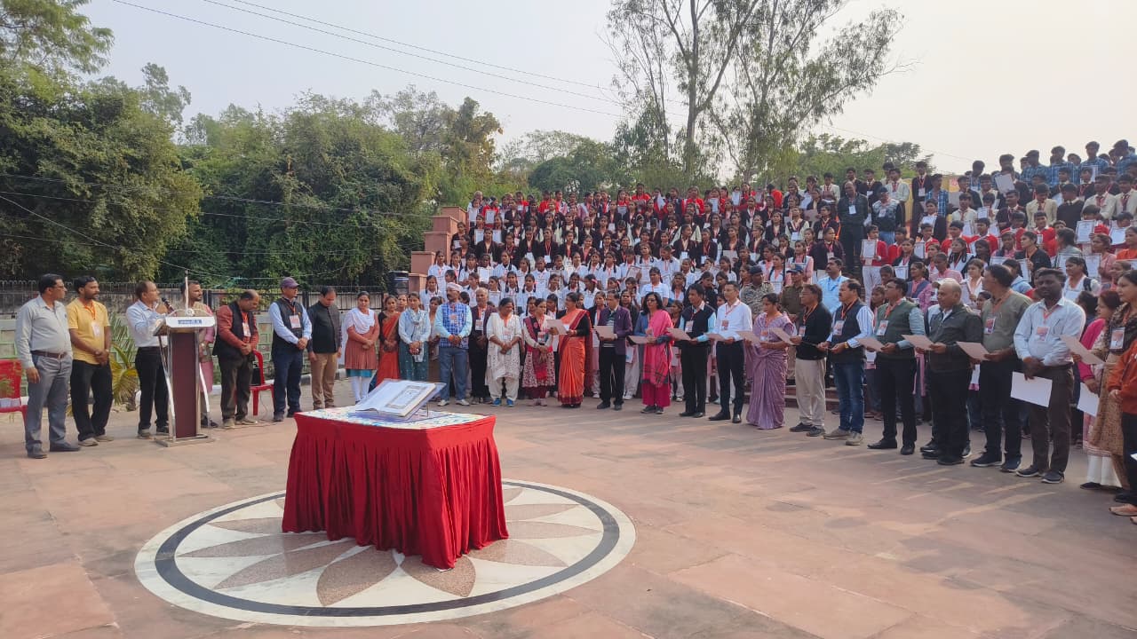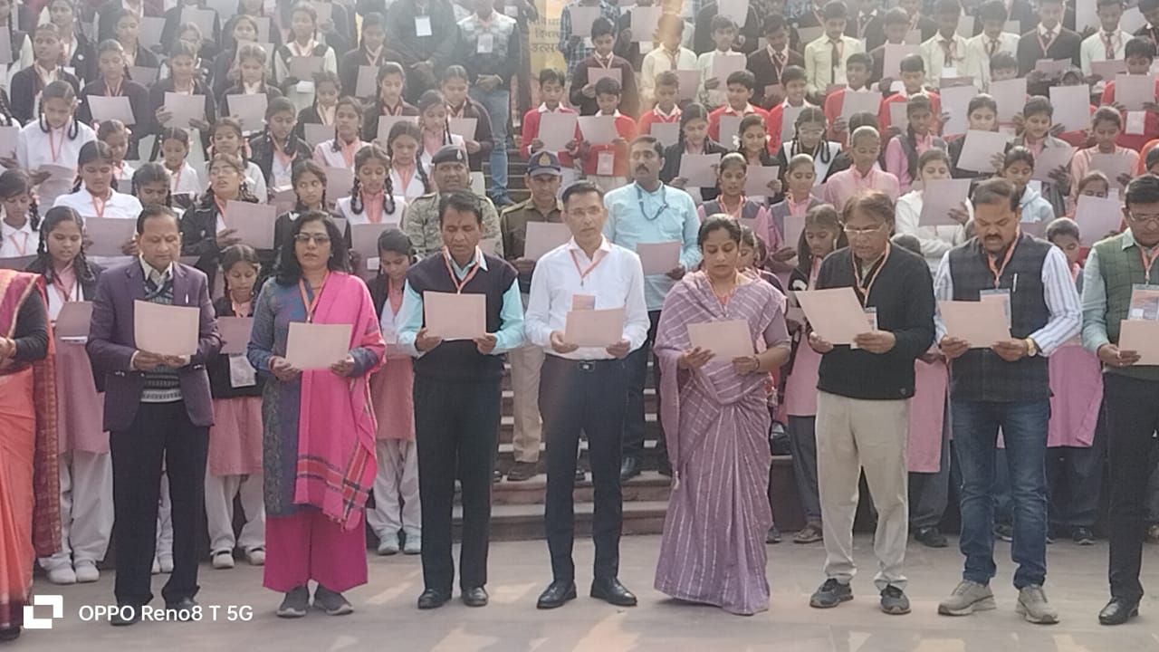 दमोह देश के संविधान दिवस पर कलेक्टर सुधीर कुमार कोचर के नेतृत्व में शहर के बेलाताल तालाब स्थित पार्क में बने ओपन थियेटर में एक विस्तृत एवं प्रेरणादायी कार्यक्रम का आयोजन किया गया। इस कार्यक्रम का उद्देश्य भारतीय संविधान की मूल भावना, उसके निर्माण, उसकी संरचना एवं नागरिकों के अधिकारों-कर्तव्यों के प्रति जागरूकता बढ़ाना था। संविधान सभा के सदस्यों की तरह जिले के विभिन्न स्कूलों से आए 299 छात्र-छात्राओं ने मंच पर एक साथ बैठकर संविधान की प्रस्तावना का सामूहिक वाचन किया। यह दृश्य न केवल आकर्षक रहा बल्कि बच्चों में लोकतांत्रिक मूल्यों के प्रति समझ और सम्मान को भी दर्शाता रहा।