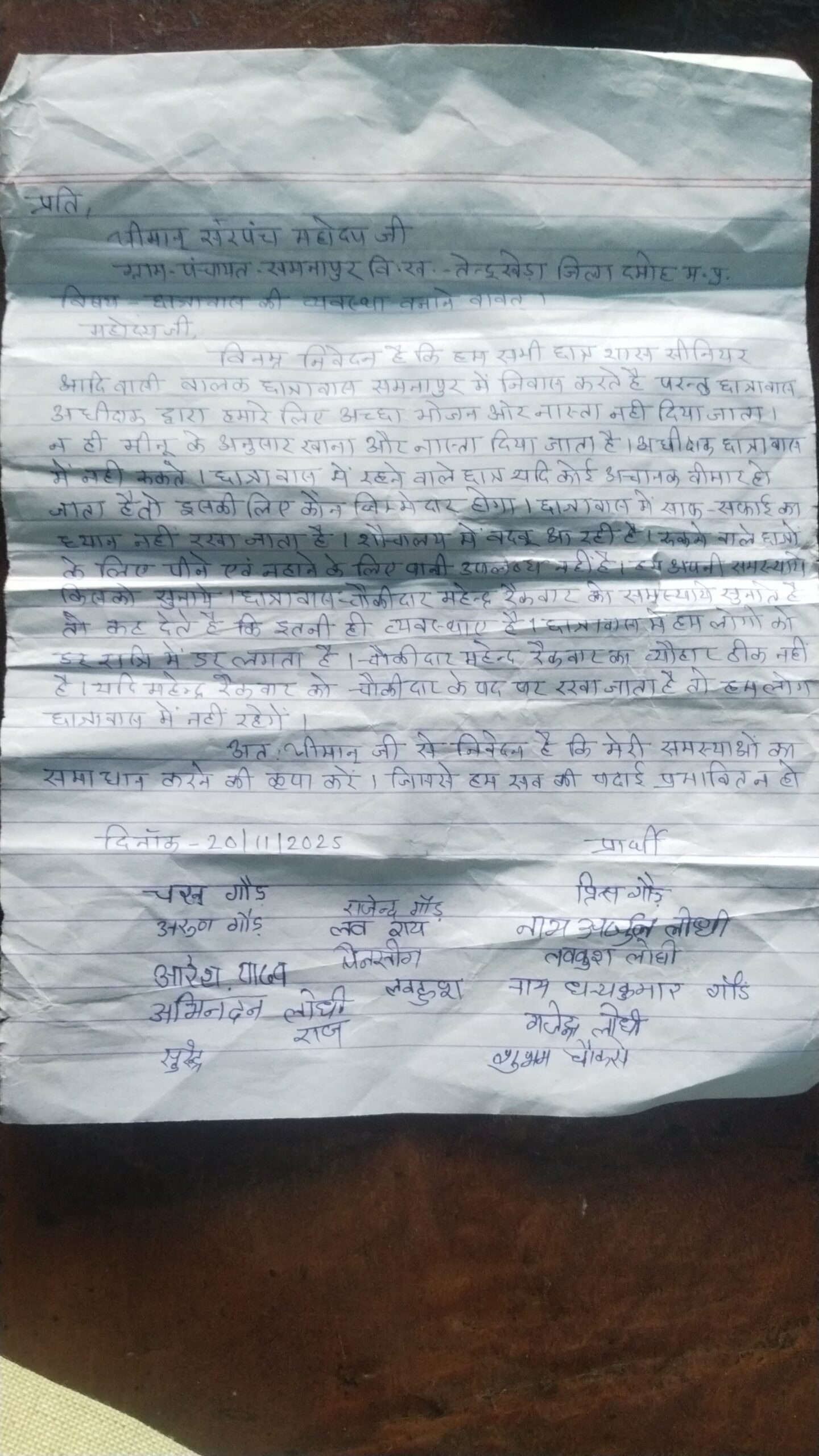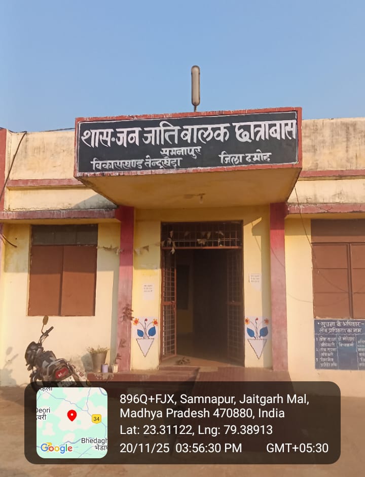 दमोह/आदिम जाति कल्याण विभाग द्वारा संचालित समनापुर सीनियर बालक छात्रावास इन दिनों गंभीर अव्यवस्थाओं और जिम्मेदार अधिकारियों की लापरवाही से घिरा हुआ है। छात्रावास में निवासरत छात्रों ने ग्राम पंचायत समनापुर की सरपंच को लिखित आवेदन देकर अधीक्षक सुनील बंसल और चौकीदार महेंद्र रैकवार के खिलाफ गंभीर आरोप लगाए हैं। छात्रों का कहना है कि लगातार शिकायतों के बाद भी कोई सुनवाई नहीं हुई, जिसके कारण वे स्वयं को असुरक्षित और परेशान महसूस कर रहे हैं।