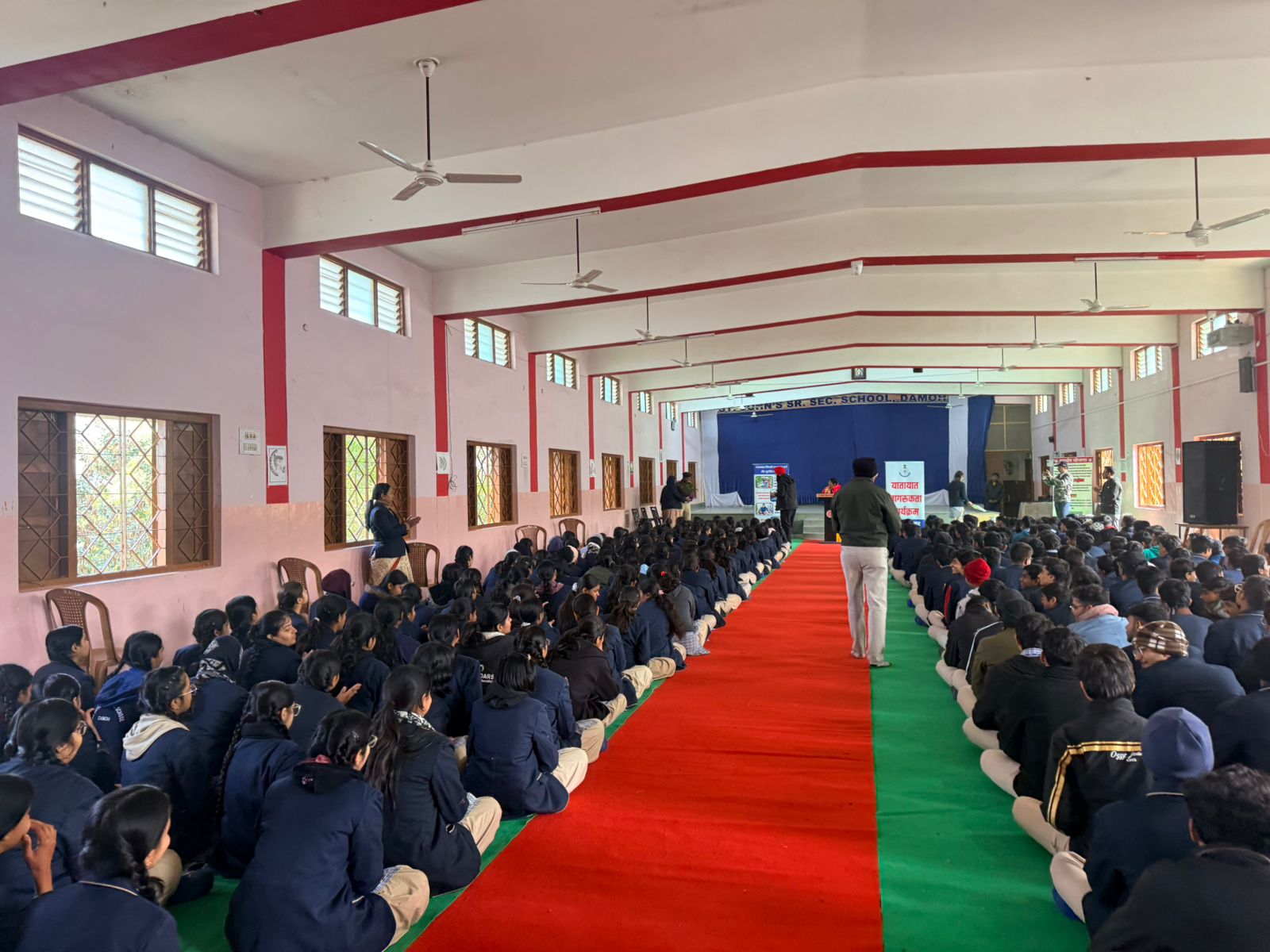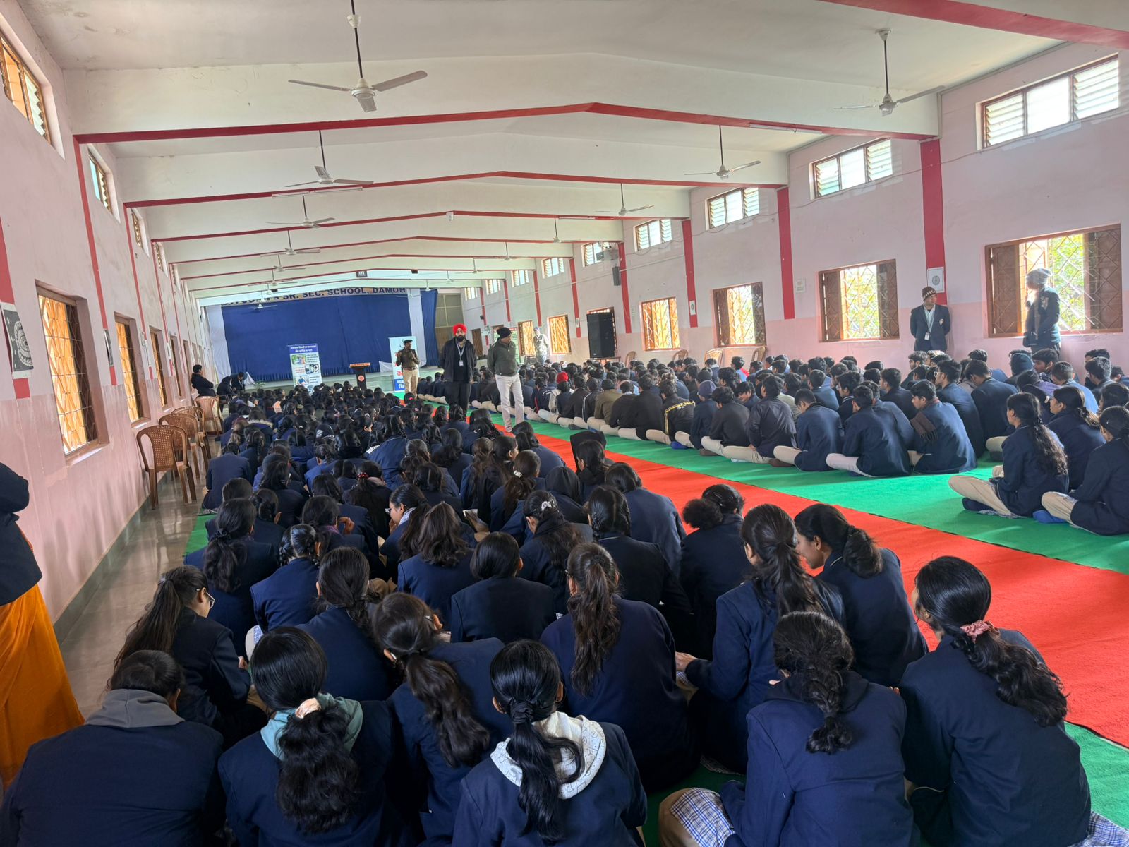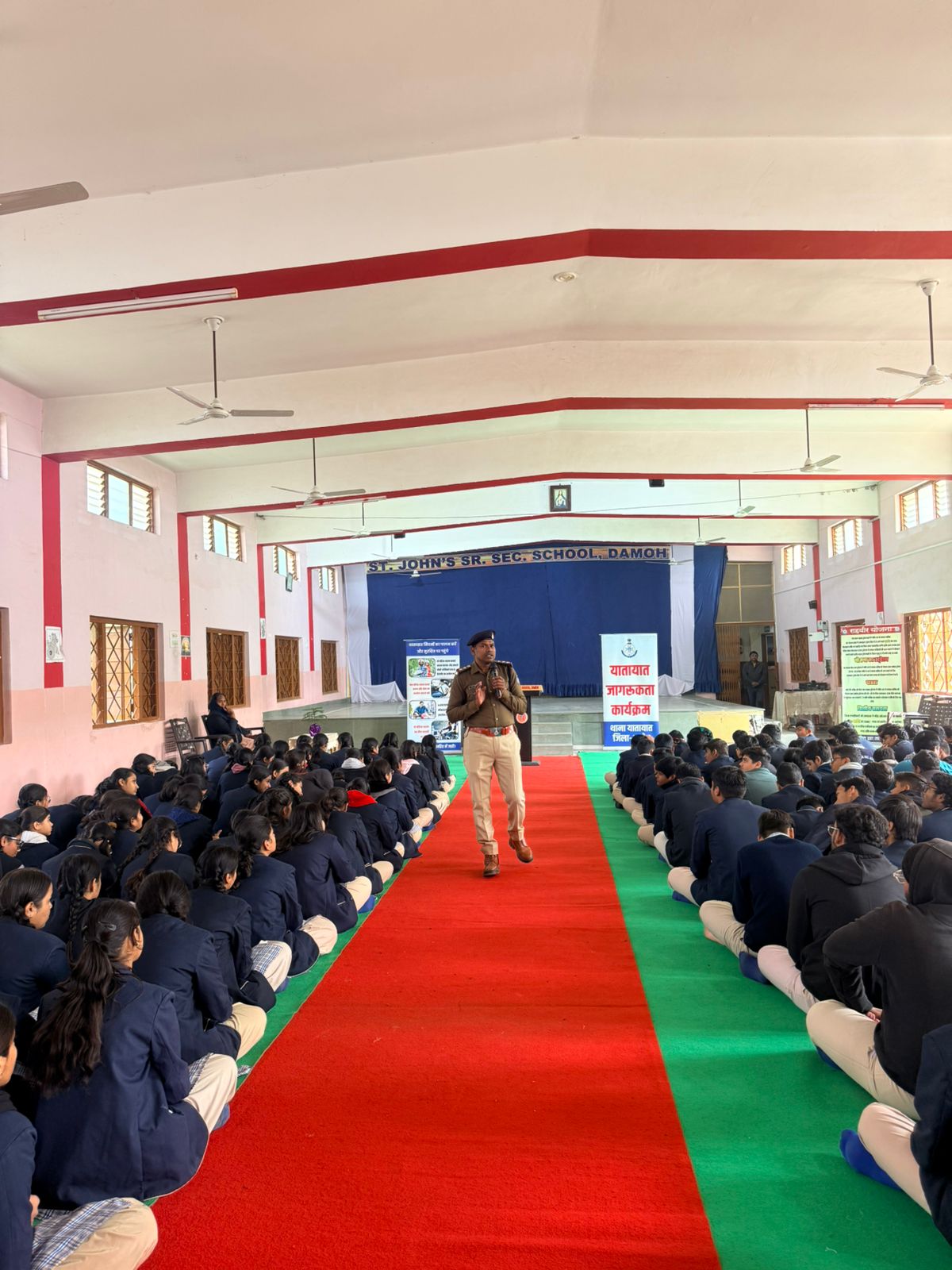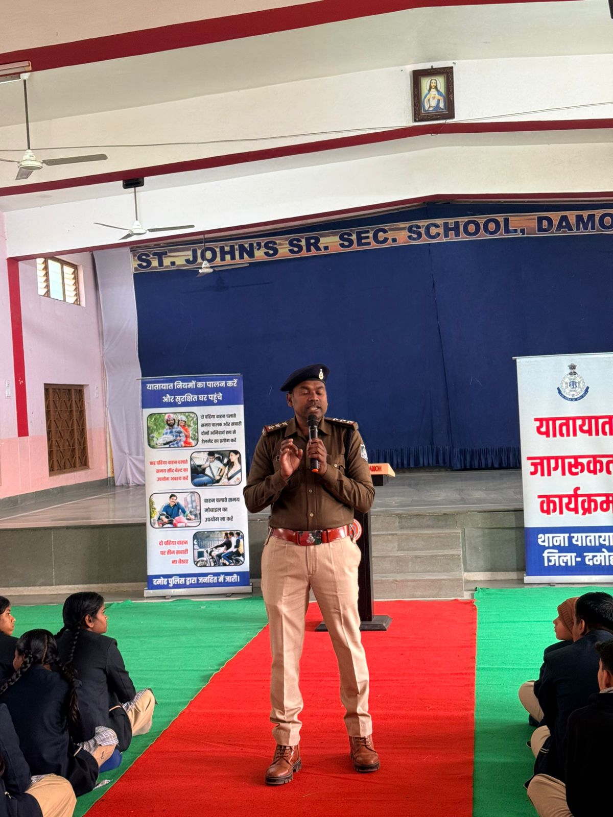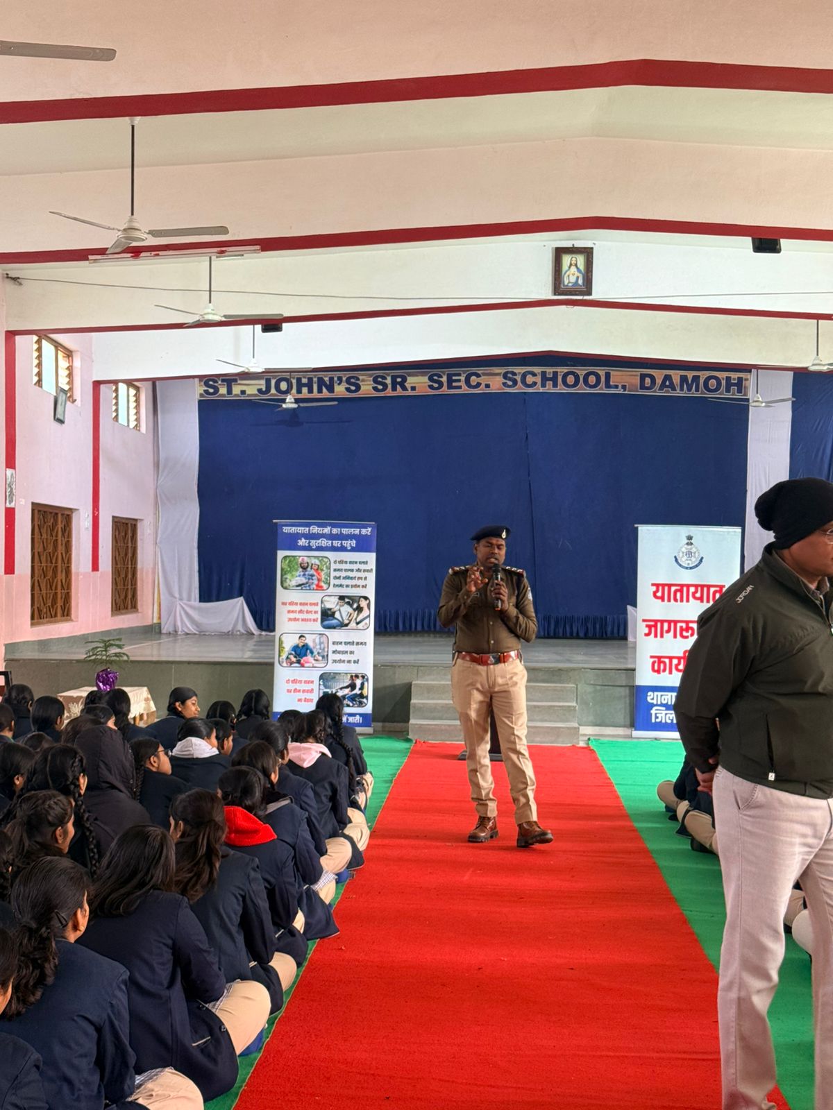 इसी अभियान के तहत दिनांक 08 जनवरी 2026 को थाना प्रभारी यातायात श्री दलवीर सिंह मार्को द्वारा सेंट जॉन्स सीनियर सेकेंडरी स्कूल, दमोह में यातायात जागरूकता कार्यक्रम आयोजित किया गया। कार्यक्रम में विद्यालय के लगभग 450 छात्र-छात्राओं एवं स्कूल स्टाफ को यातायात नियमों की विस्तृत जानकारी दी गई।