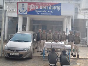 तेजगढ़ (दमोह) | जिले में नशे के विरुद्ध चलाए जा रहे विशेष अभियान के तहत तेजगढ़ पुलिस को एक बड़ी सफलता हाथ लगी है। पुलिस ने घेराबंदी कर अवैध शराब का परिवहन कर रही एक लग्जरी कार को जब्त किया है। इस कार्रवाई में पुलिस ने करीब 4.33 लाख रुपये का मशरूका बरामद करते हुए दो युवकों को गिरफ्तार किया है।