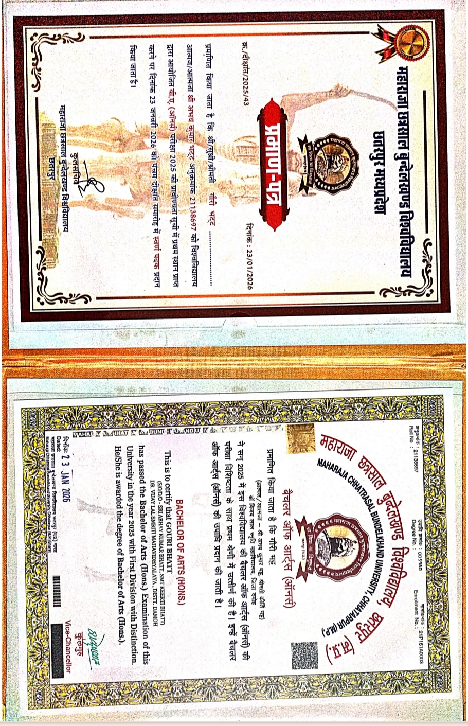 समारोह के दौरान मध्य प्रदेश के महामहिम राज्यपाल मंगु भाई पटेल ने गौरी भट्ट को बी.ए. ऑनर्स (परीक्षा 2025) की मेरिट सूची में प्रथम स्थान प्राप्त करने पर स्वर्ण पदक (Gold Medal) और उपाधि प्रदान कर सम्मानित किया।