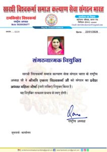 इस अवसर पर श्रीमती एकता विश्वकर्मा ने संगठन के प्रति हृदय से आभार व्यक्त करते हुए कहा कि “मुझ पर विश्वास जताते हुए विश्वकर्मा समाज के प्रदेश अध्यक्ष महिला मोर्चा का दायित्व सौंपा गया, यह मेरे लिए अत्यंत गर्व एवं जिम्मेदारी का विषय है। मैं पूरे समर्पण, निष्ठा और ईमानदारी के साथ समाज की सेवा करूँगी तथा संगठन की गरिमा को सदैव बनाए रखने का प्रयास करूंगी। आप सभी के सहयोग एवं मार्गदर्शन की अपेक्षा रहेगी।”