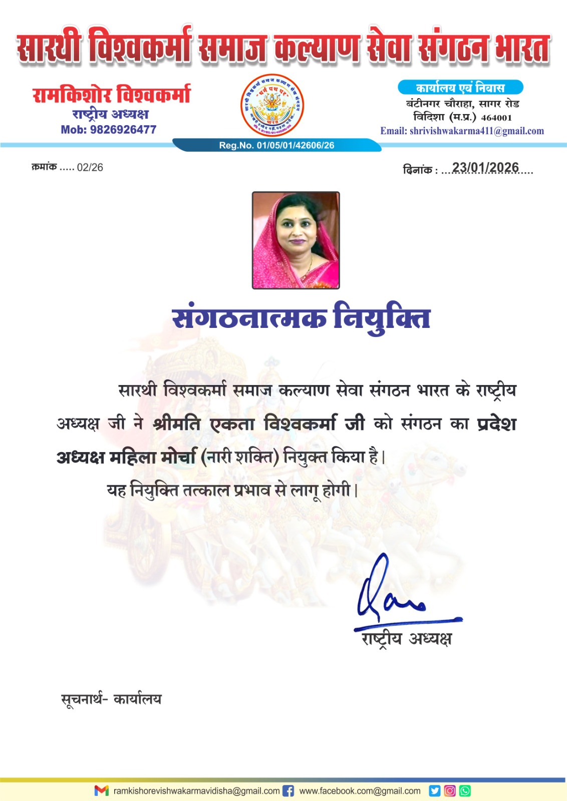 सारथी विश्वकर्मा समाज सेवा कल्याण संगठन भारत द्वारा संगठनात्मक मजबूती की दिशा में एक महत्वपूर्ण निर्णय लिया गया है। संगठन के राष्ट्रीय अध्यक्ष श्रीमान रामकिशोर विश्वकर्मा एवं राष्ट्रीय महिला मोर्चा अध्यक्ष श्रीमती उमा विश्वकर्मा के संयुक्त निर्णय से दमोह निवासी श्रीमती एकता विश्वकर्मा को प्रदेश अध्यक्ष, महिला मोर्चा के दायित्व से नवाजा गया है।