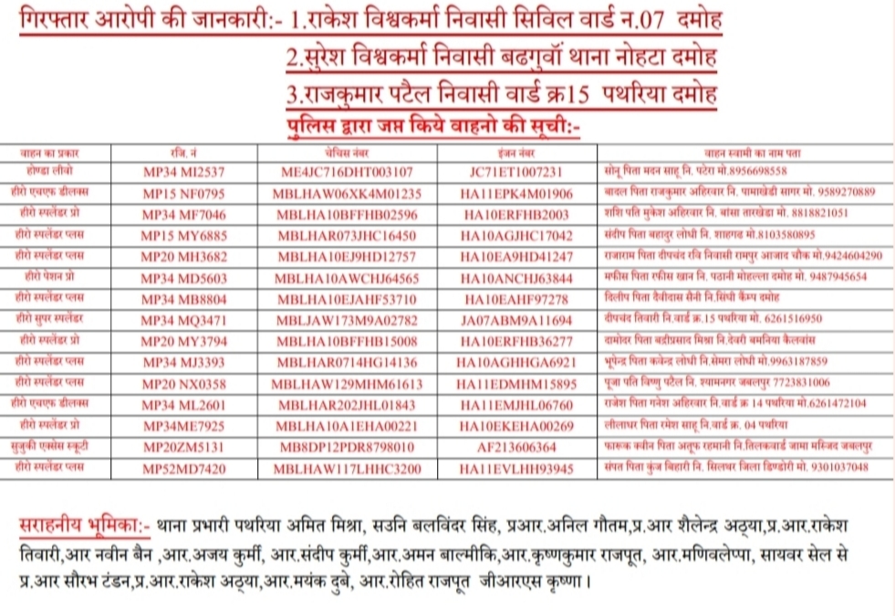 दमोह में 15 चोरी की बाइक बरामद, 3 आरोपी गिरफ्तार
